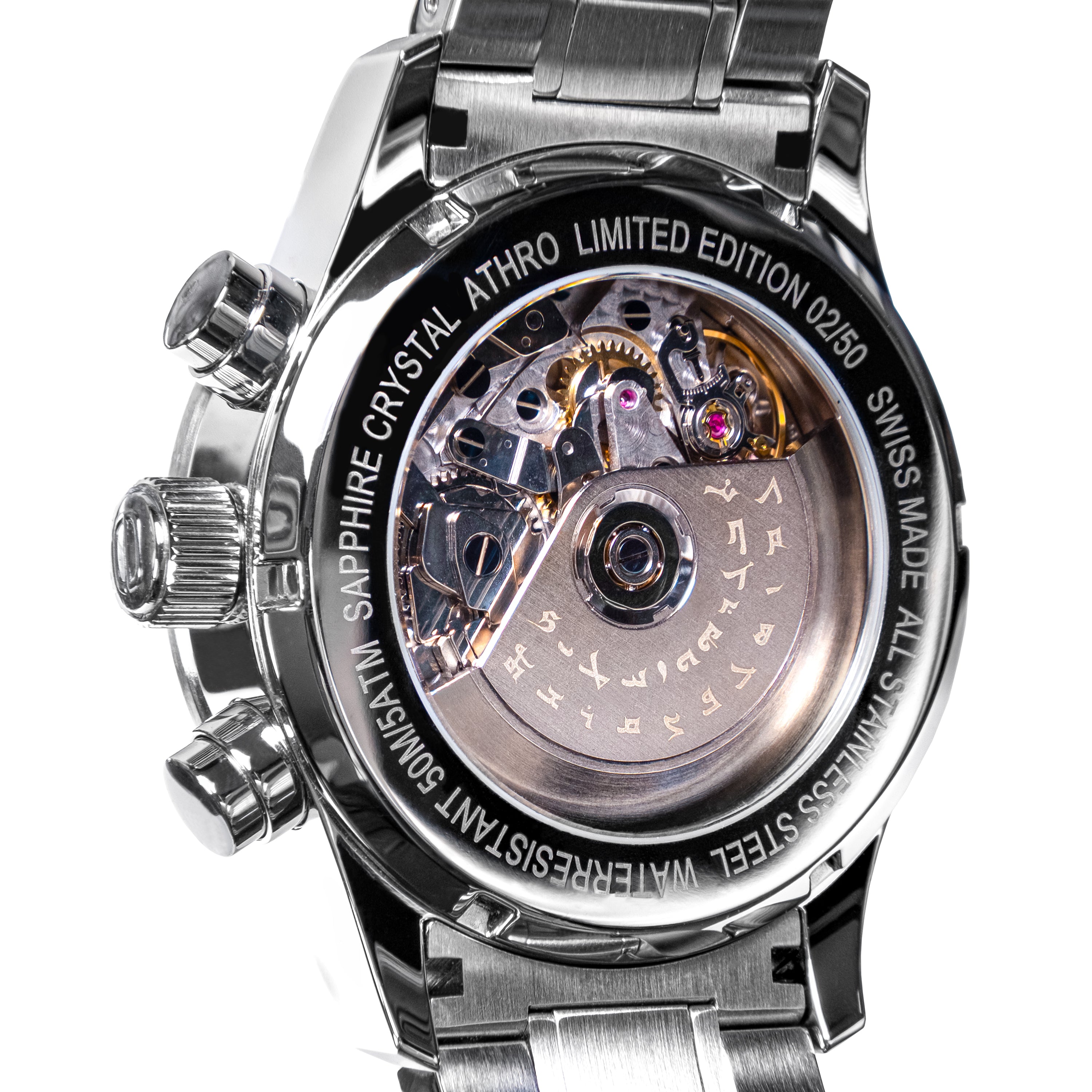 We deliberately chose the tried-and-tested Valjoux 7750 and combined it with a dial that carries history. The Aramaic numerals lend the classic Swiss mechanism a cultural identity.